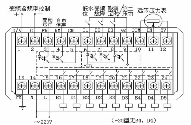 變頻泵控制輸出,接交流220V接觸器,觸點容量5A。當(dāng)驅(qū)動大功率接觸器時,請加中間繼電器,以下同。 |