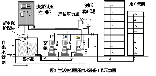 該設(shè)備以水泵出水端水壓(或用戶用水流量)為設(shè)定參數(shù),通過(guò)微機(jī)自動(dòng)控制變頻器的輸出頻率從而調(diào)節(jié)水泵電機(jī)的轉(zhuǎn)速,實(shí)現(xiàn)用戶管網(wǎng)水壓的閉環(huán)調(diào)節(jié),使供水系統(tǒng)自動(dòng)恒穩(wěn)于設(shè)定的壓力值:即用水量增加時(shí),頻率提高,水泵轉(zhuǎn)速加快;用水量減少時(shí),頻率降低,水泵轉(zhuǎn)速減慢。這樣就保證了整個(gè)用戶管網(wǎng)隨時(shí)都有充足的水壓(與用戶設(shè)定的壓力一致)和水量(隨用戶的用水情況變化而變化)。