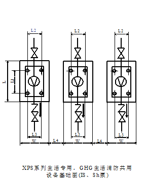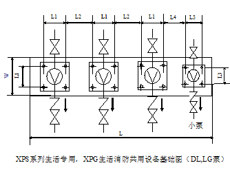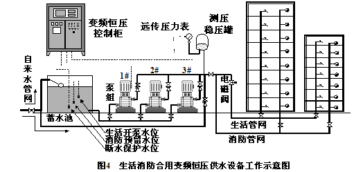 該設(shè)備與XPS生活專用型設(shè)備相比,基本組成相同,不同的是:具有兩個(gè)恒壓值,高低壓差0.1~0.25Mpa內(nèi)任意設(shè)定。平時(shí)低恒壓運(yùn)行滿足生活供水要求,發(fā)生火災(zāi)自動(dòng)轉(zhuǎn)入高恒壓,同時(shí)關(guān)閉電磁閥,只對(duì)消防管路供水達(dá)到消防供水要求。該系統(tǒng)要求泵組選擇能夠滿足消防要求。系統(tǒng)圖(以三臺(tái)主泵為例)見圖4