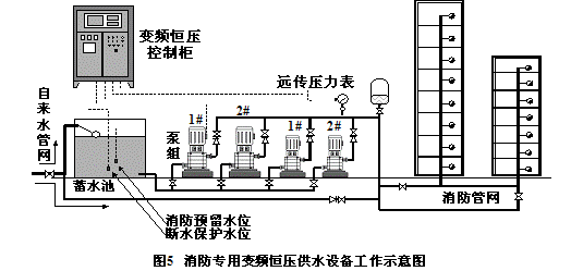 XPX型消防恒壓供水設(shè)備系采用智能控制器或可編程控制器(PLC)對(duì)變頻泵組、穩(wěn)壓泵進(jìn)行控制。XPX型消防供水設(shè)備可接受消火栓火警信號(hào)、水流指示信號(hào)、消防控制中心指揮信號(hào)、水噴淋報(bào)警閥信號(hào)、消防水箱液位信號(hào)、壓力開關(guān)信號(hào)等各種信號(hào)來(lái)自動(dòng)起動(dòng)消防水泵,并由水壓反饋信號(hào)來(lái)決定投運(yùn)水泵的時(shí)間和臺(tái)數(shù),以滿足消防供水的需要。該系統(tǒng)平時(shí)由穩(wěn)壓泵(或消防穩(wěn)壓系統(tǒng))維持系統(tǒng)壓力,使管網(wǎng)始終處于消防所需的工作壓力;當(dāng)火警時(shí),穩(wěn)壓泵不能維持設(shè)定壓力而降至某壓力值時(shí),自動(dòng)起動(dòng)一臺(tái)消防泵,如壓力繼續(xù)下降,再起動(dòng)二#臺(tái)泵,其中任一臺(tái)泵有故障,備用泵自動(dòng)投入運(yùn)行。系統(tǒng)圖(以二臺(tái)主泵為例)見圖5。